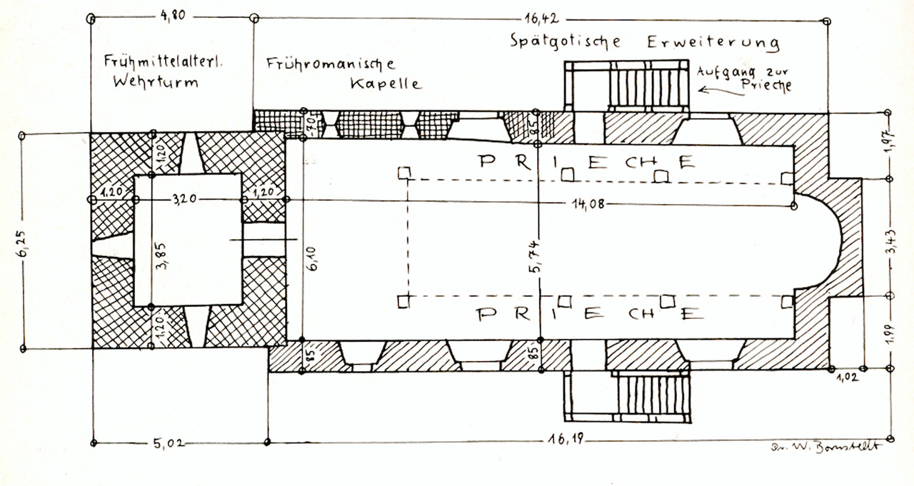 Auch der Bau des spätromanischen Turms um 1200 bis 1230 ist nicht durch urkundliche Unterlagen gesichert. Da der Turm mit seinen Ausmaßen von 6,25m mal 4,8m und einer Mauerstärke von 1,2m in die „karolingische“ Kapelle teilweise hineinragt, ist anzunehmen, dass in dieser Zeit die frühe Kirche umgebaut wurde.