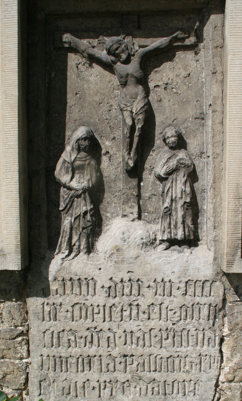 Die Kirche hat dann im 15. Jh. eine Erweiterung erfahren. Es ist anzunehmen, dass die ehemals romanische Kirche eine gotische Vergrößerung erhalten hat. Eine Weihetafel an der Apsis am östlichen Teil der Kirche weist darauf hin. Darauf ist Christus am Kreuz auf einer Erhöhung und rechts und links davon Maria und Johannes von vorn dargestellt. Die darunter vertieft eingehauene Miniskulienschrift war schon 1760 schwer entzifferbar und lautet etwa: